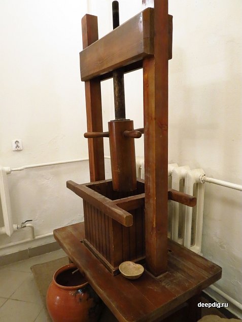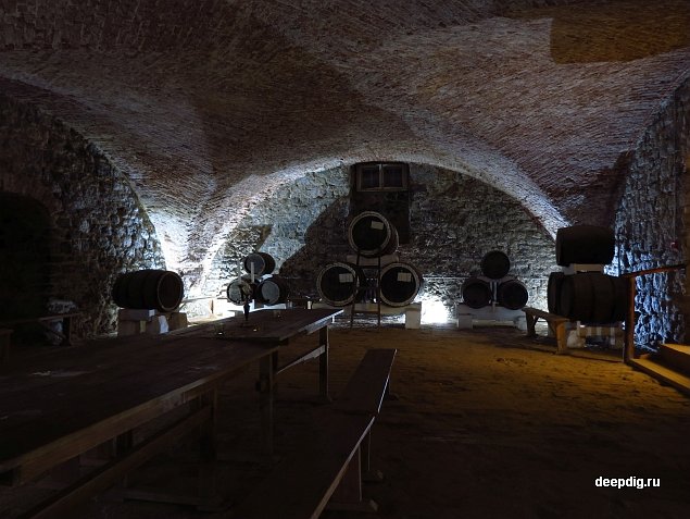 Наконец, преодолев гладкий ледяной подъём, мы подошли к торцу здания, и экскурсовод открыл дверь в подвал. Он оказался довольно большим и состоял из двух помещений. В былые времена здесь хранились лекарства, продуктовые запасы аптекарской семьи, и сушились целебные травы.