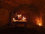 В 4 подвал Гостевого дома Беккера (XVIII в.) мы спустились уже всей огромной толпой. Здесь явно проводились какие-то оккультные мероприятия, так как в первом зале на столах были расставлены канделябры и свечи, а также в левом дальнем углу красовалась какая-то фигура в белом балахоне (хорошо, что хотя бы без косы). Во втором зале нам рассказали несколько традиционных сарептских легенд: о бедной дочери Крауствурста и механическом рыцаре, о призраке владельца гончарного завода Ниденталя, о таинственном ограблении библиотеки в доме Лангерфельда.