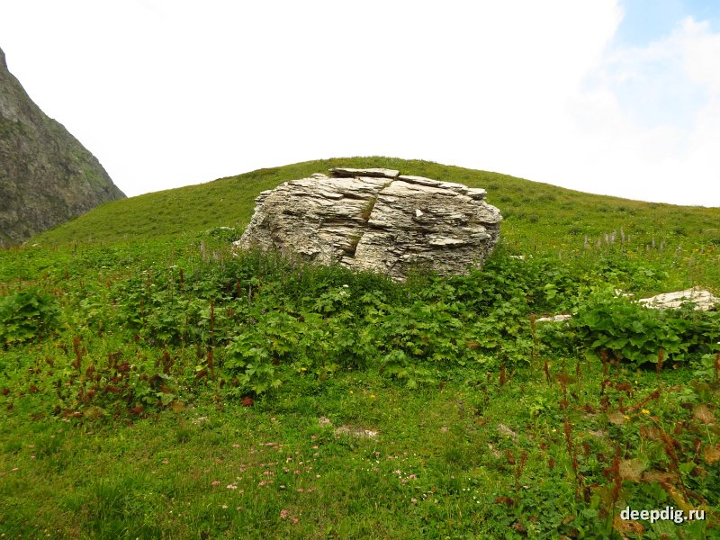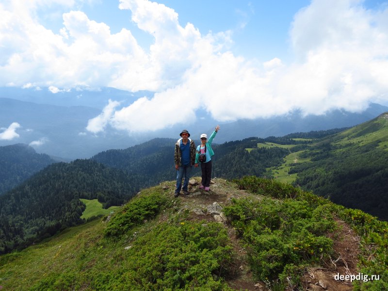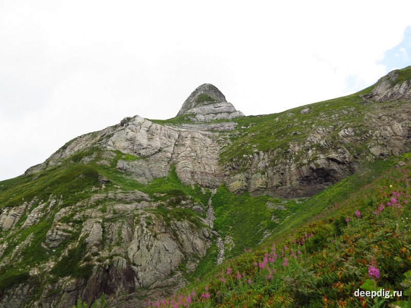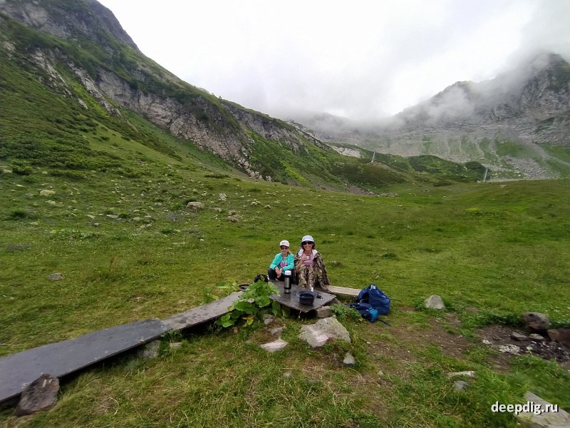 На перевале между Пиками 4 и 5 мы устроили небольшой привал, наслаждаясь созерцанием великолепной вершины Седая Аибга. Мы надеялись, что туда ведёт тропа, но её не оказалось.