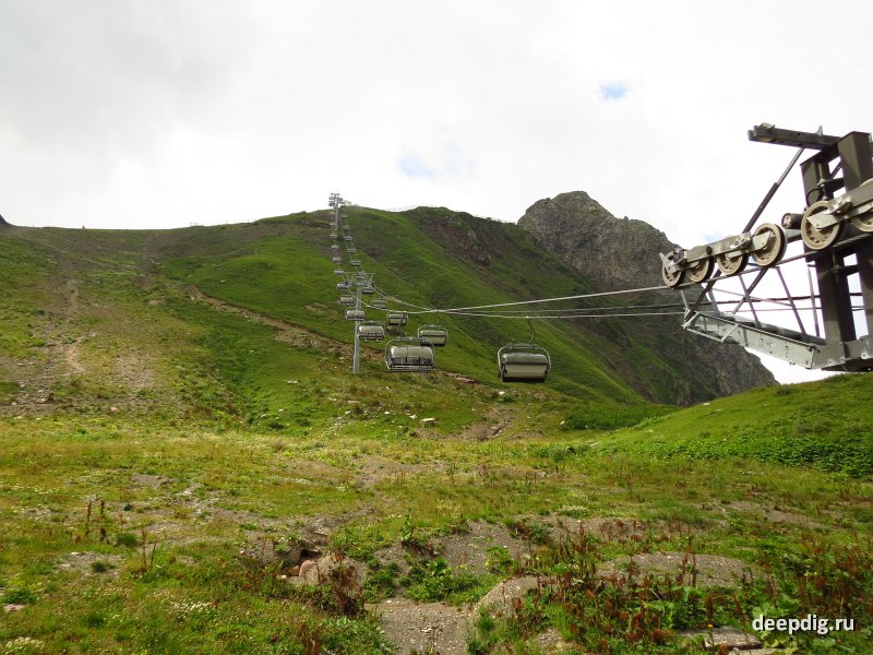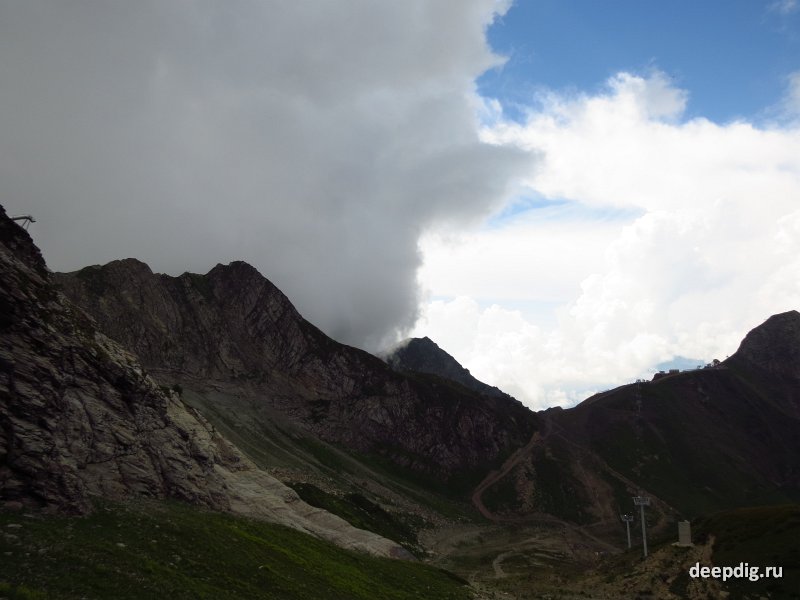 За Третьим Цирком нас ждал подъем к пику Чёрная Пирамида (2375 метров). Там погода ухудшилась, сгустился туман, стало холодно. Но от Чёрной Пирамиды уже начиналась действующая ветка канатной дороги. Мы решили прокатится на ней вниз до следующего цирка. |