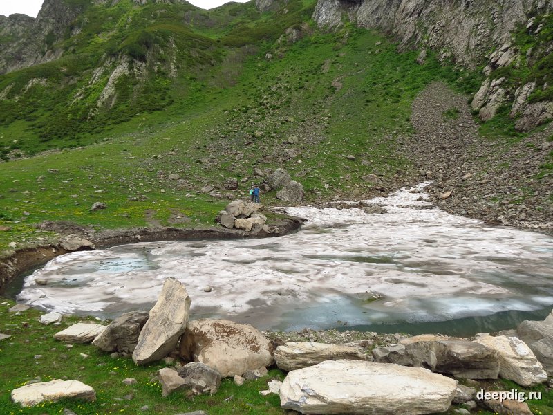 Оказалось, что если пройти по тропинке, ведущей к отрогу, то по пути будет два озера, второе из которых – ледяное! Это зрелище, от которого действительно захватывает дух! Особенно, когда знаешь, что снизу, в Адлере, лето и плюс 35. А тут – лёд и цветы одновременно! |