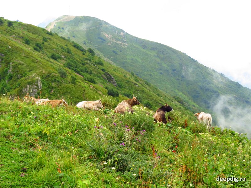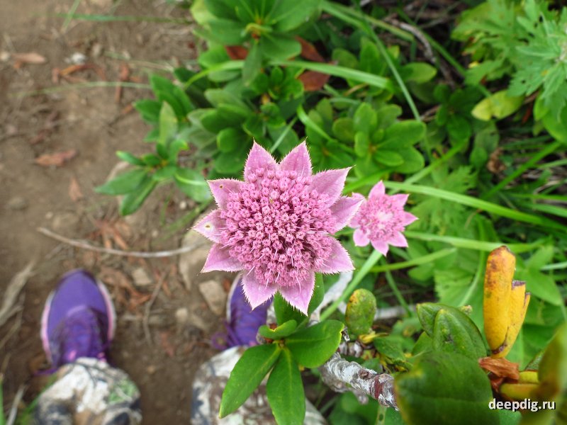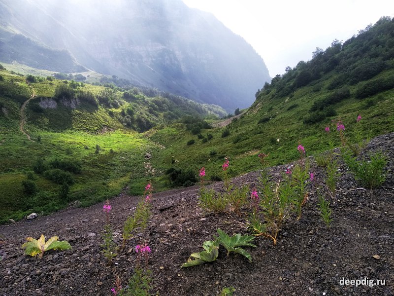 Вообще вся первая часть нашего похода от Приюта Ветров до Пика 4 была просто потрясающей: во-первых, на этой части маршрута ввиду его сложности практически нет людей (нам встретилось всего несколько групп туристов за полдня), во-вторых, тропа идёт сквозь фантастически красивые альпийские луга (жаль только, в августе рододендроны уже отцветают).