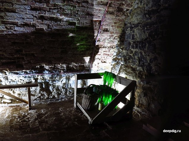 Наконец, преодолев гладкий ледяной подъём, мы подошли к торцу здания, и экскурсовод открыл дверь в подвал. Он оказался довольно большим и состоял из двух помещений. В былые времена здесь хранились лекарства, продуктовые запасы аптекарской семьи, и сушились целебные травы.