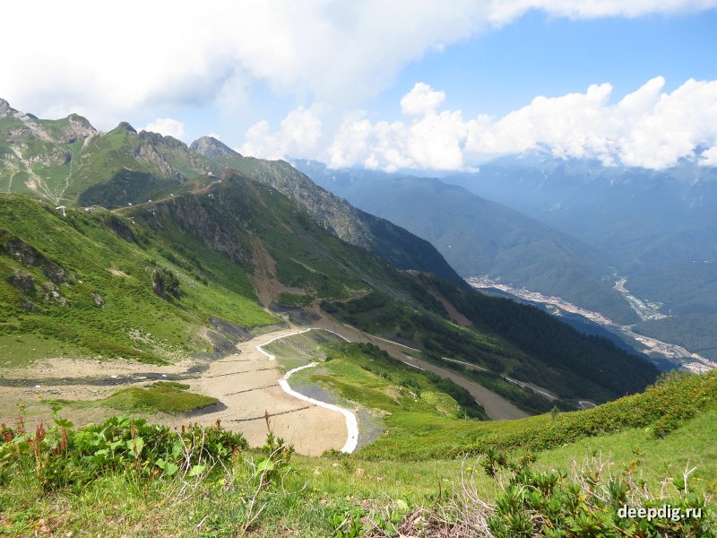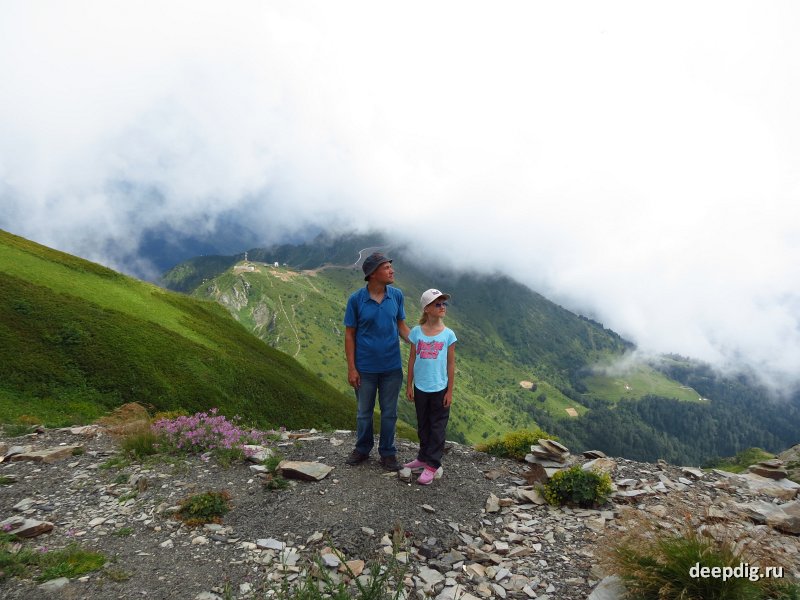 Как выяснилось позднее, дорога на Аибгу Седую начинается ближе к канатке Горной Карусели. Кстати, на перевале нам встретились туристы, которые двигались во встречном направлении и предложили нам обменяться пассами на канатки, что мы и сделали с большой радостью. Таким образом, нам удалось существенно сэкономить на последующем спуске в Красную Поляну. |