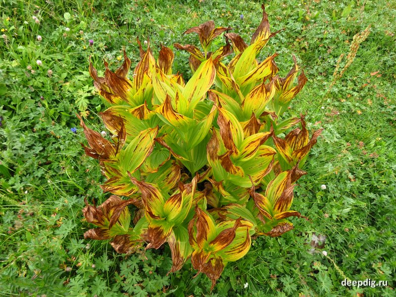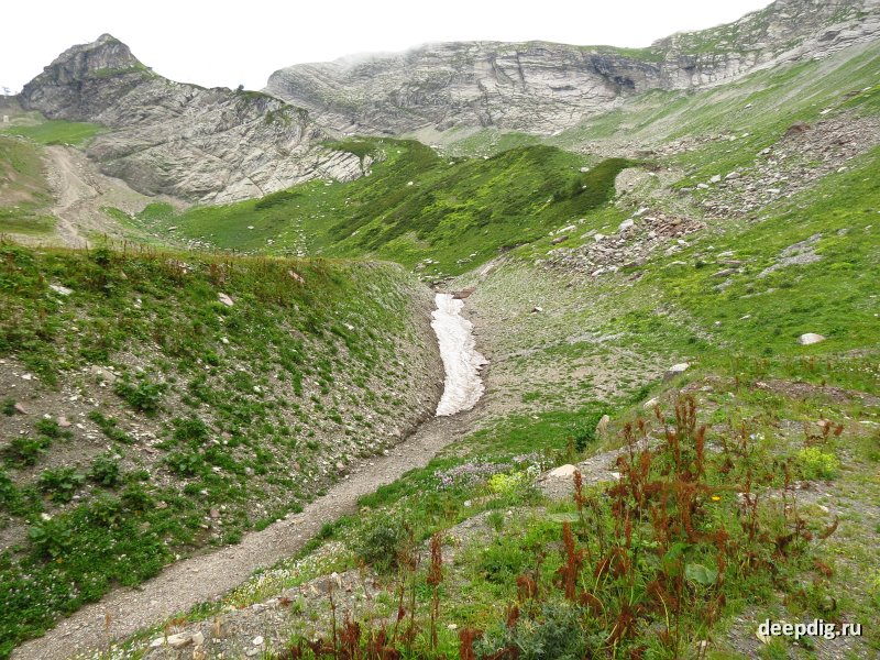 Оказалось, что если пройти по тропинке, ведущей к отрогу, то по пути будет два озера, второе из которых – ледяное! Это зрелище, от которого действительно захватывает дух! Особенно, когда знаешь, что снизу, в Адлере, лето и плюс 35. А тут – лёд и цветы одновременно! |