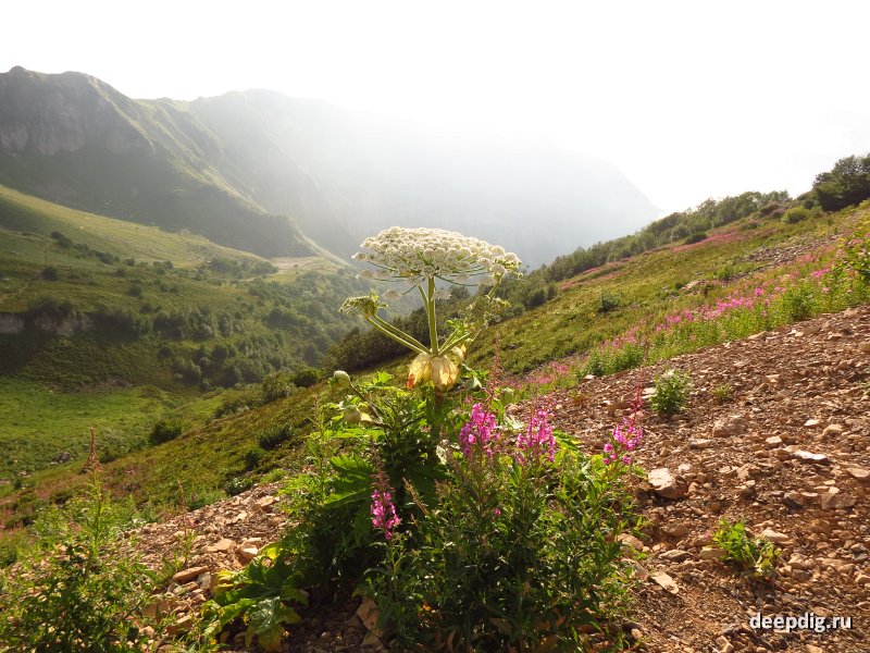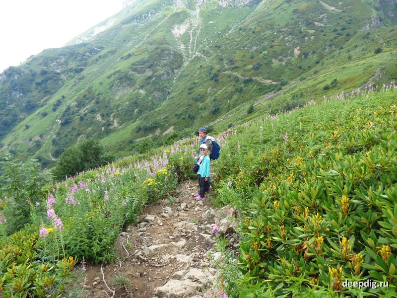 Вообще вся первая часть нашего похода от Приюта Ветров до Пика 4 была просто потрясающей: во-первых, на этой части маршрута ввиду его сложности практически нет людей (нам встретилось всего несколько групп туристов за полдня), во-вторых, тропа идёт сквозь фантастически красивые альпийские луга (жаль только, в августе рододендроны уже отцветают).