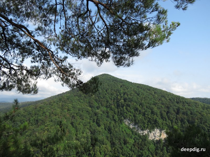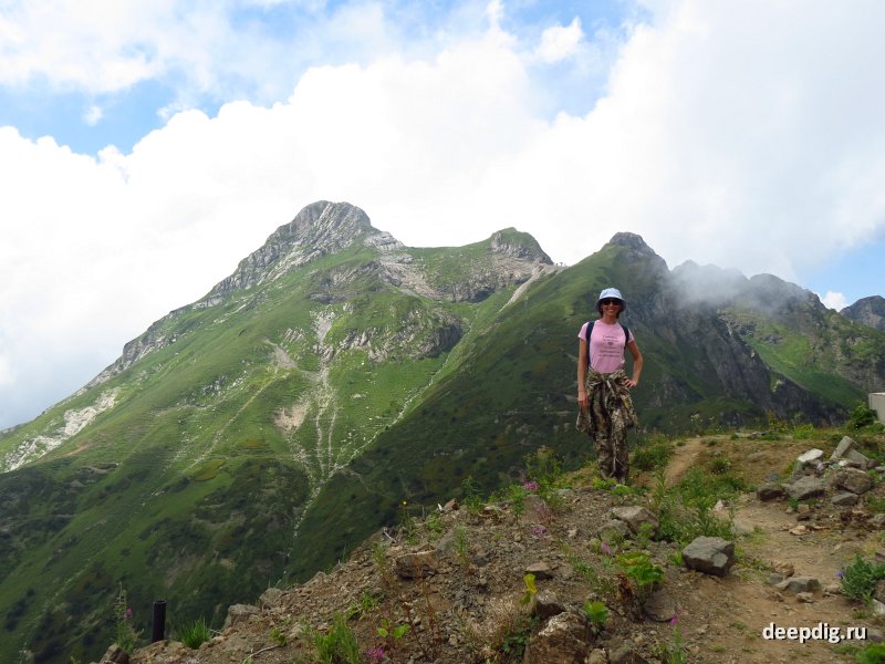 На перевале между Пиками 4 и 5 мы устроили небольшой привал, наслаждаясь созерцанием великолепной вершины Седая Аибга. Мы надеялись, что туда ведёт тропа, но её не оказалось.